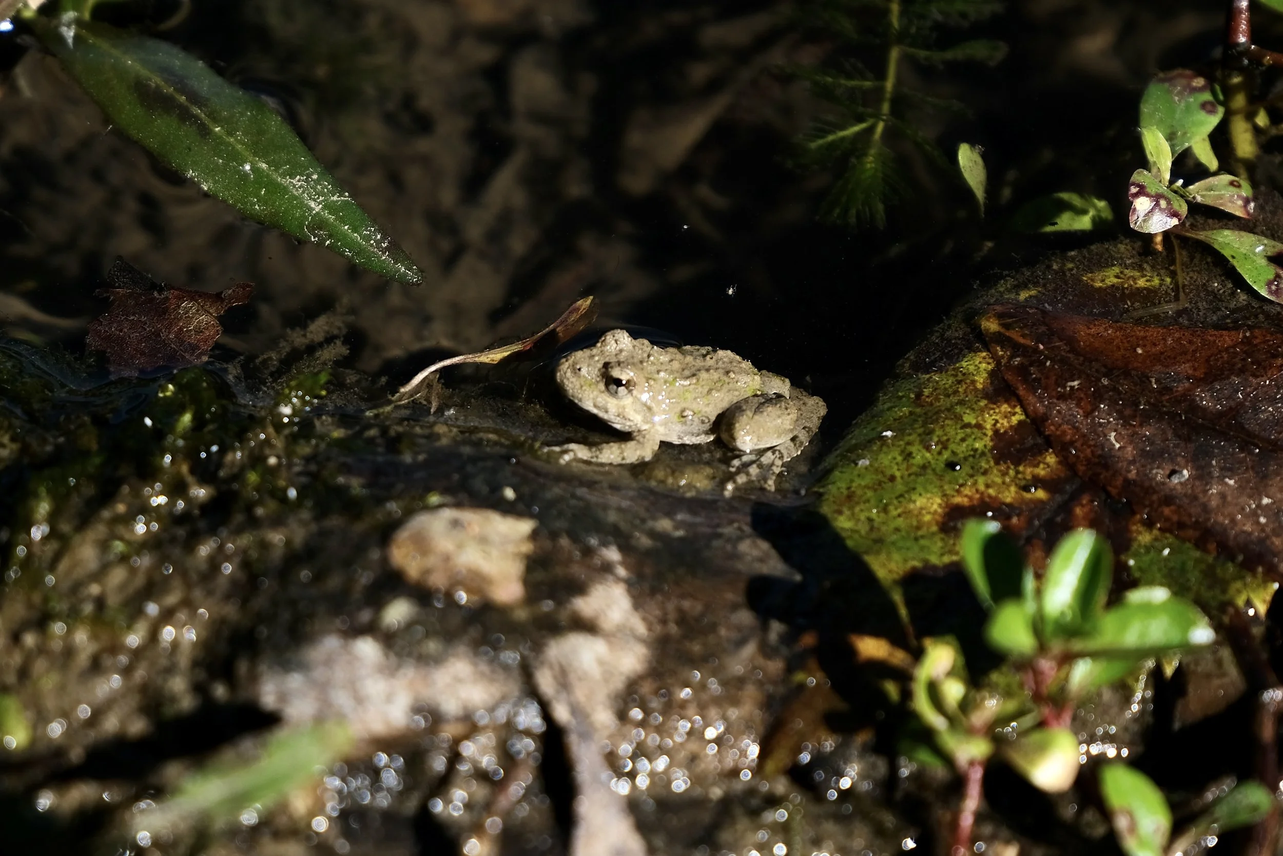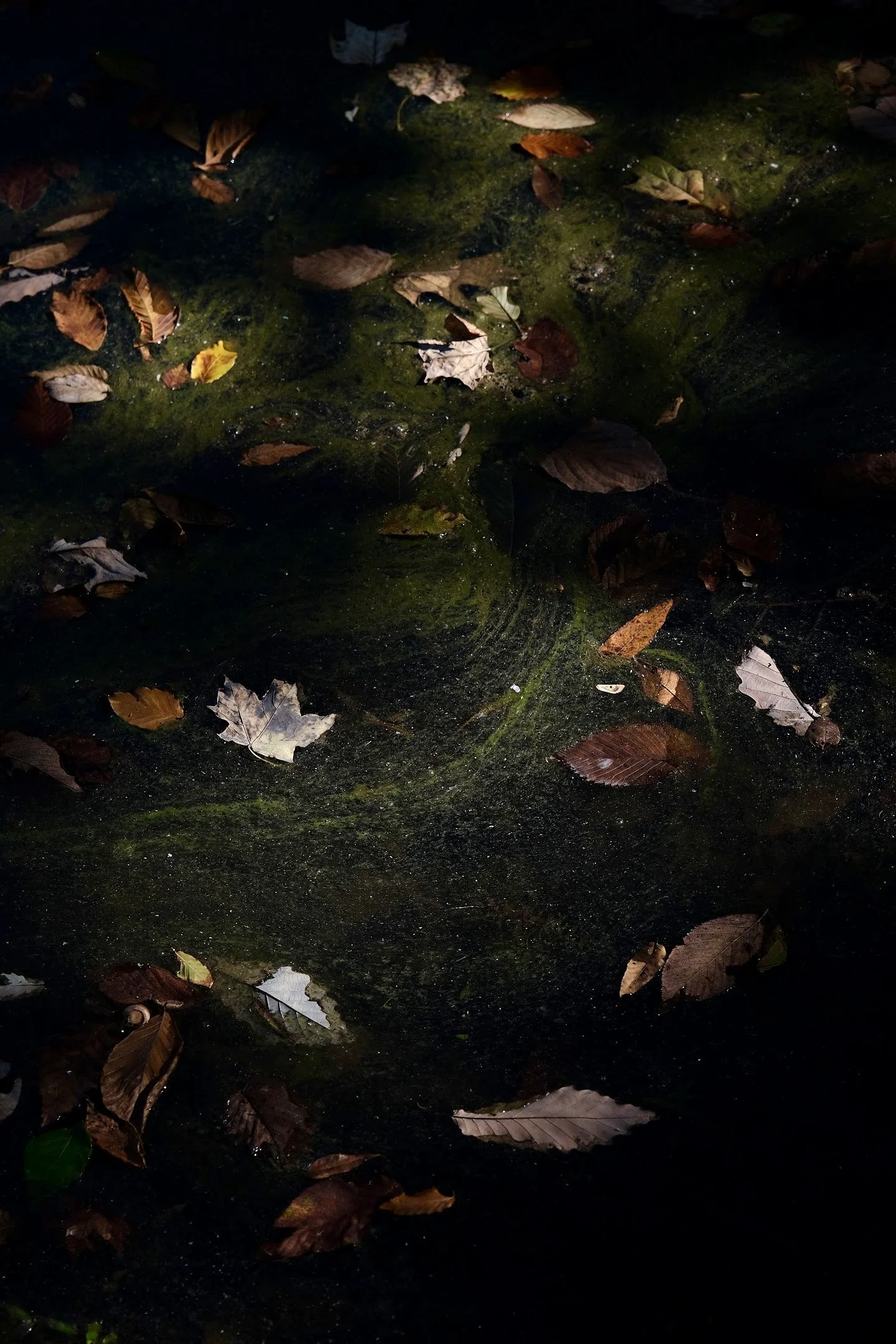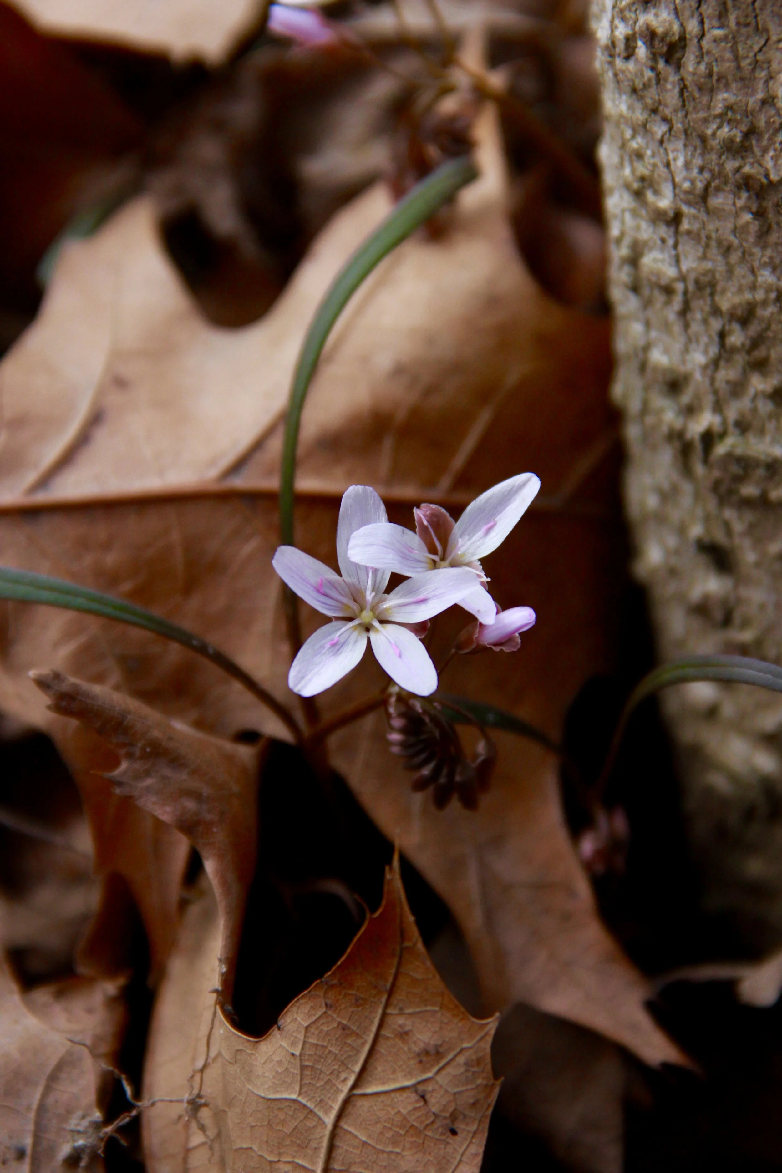 Close-up of a small flowering plant with pale pink and white flowers growing among brown fallen leaves.