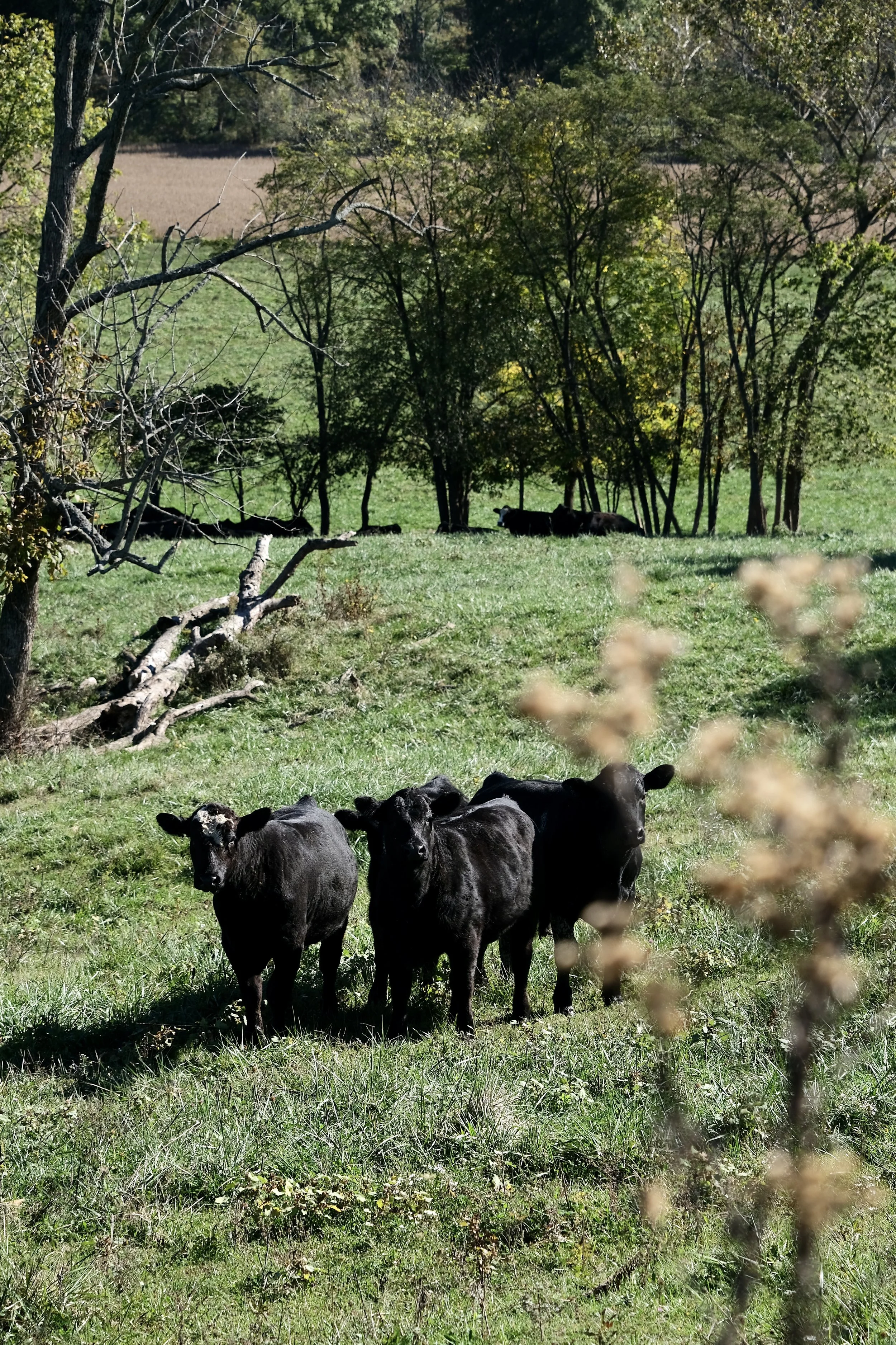 A group of three black calves standing in a green field with trees and more calves in the background.