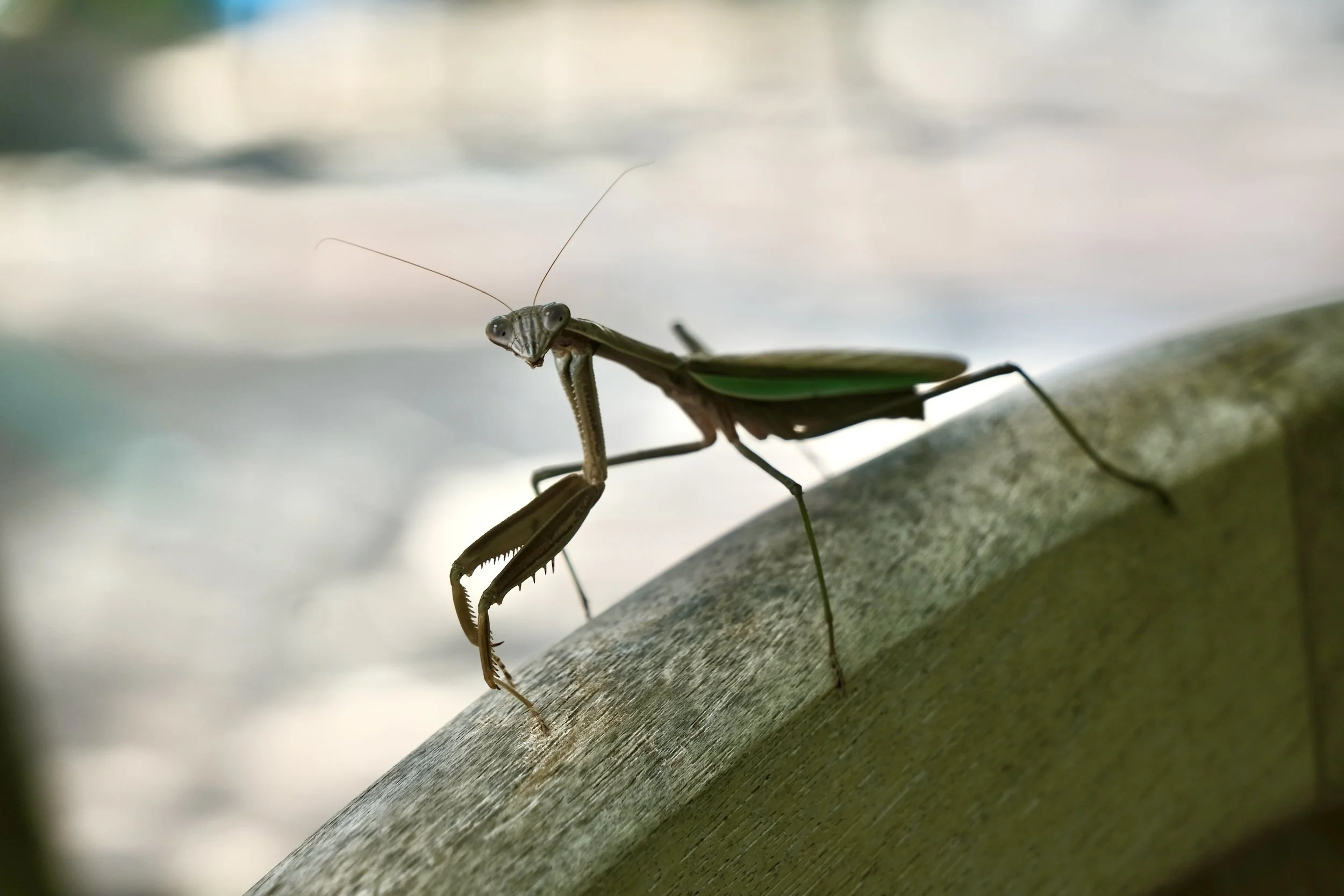 Close-up of a praying mantis perched on a leaf with a blurred natural background.