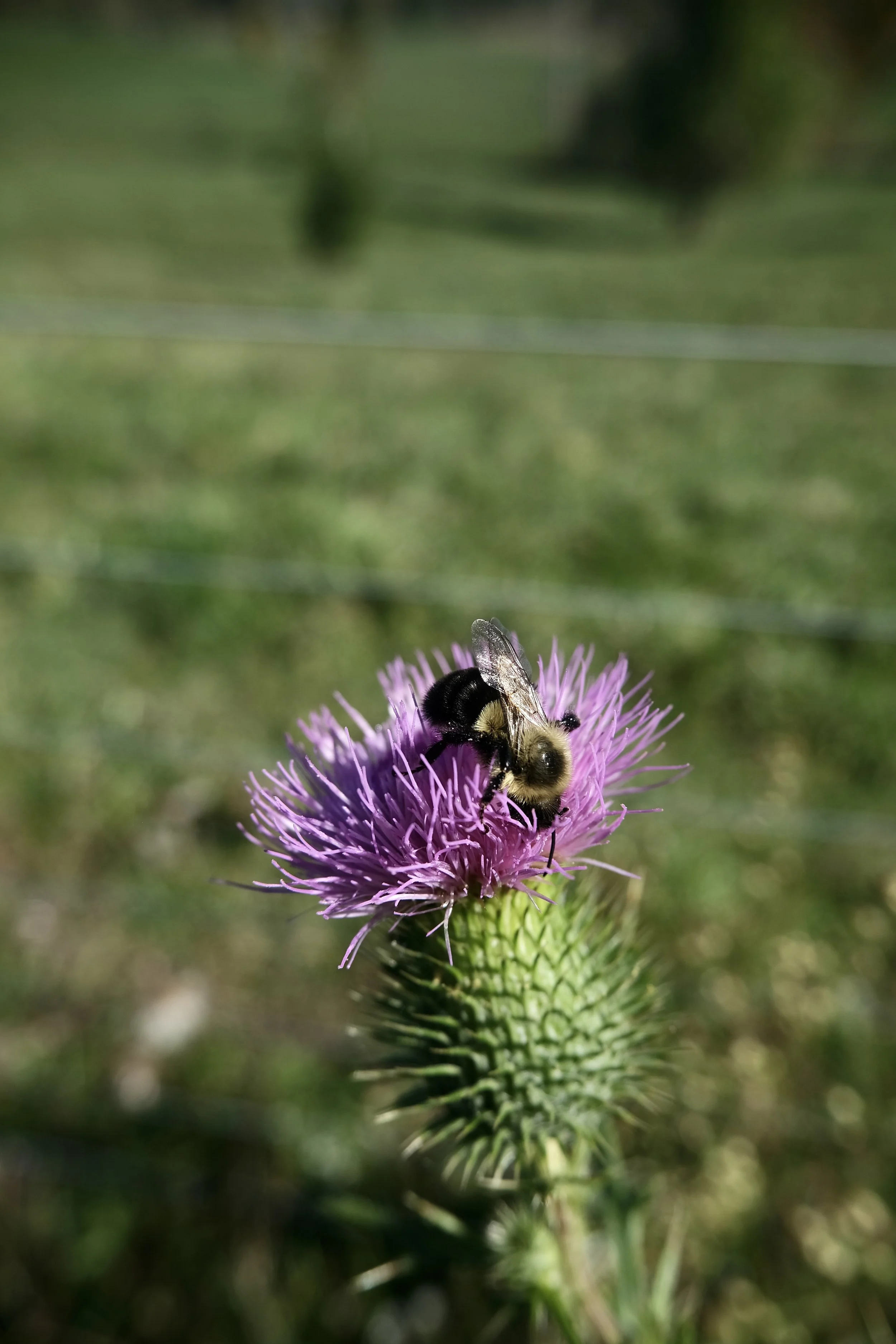A bee on a purple thistle flower in a grassy outdoor setting.