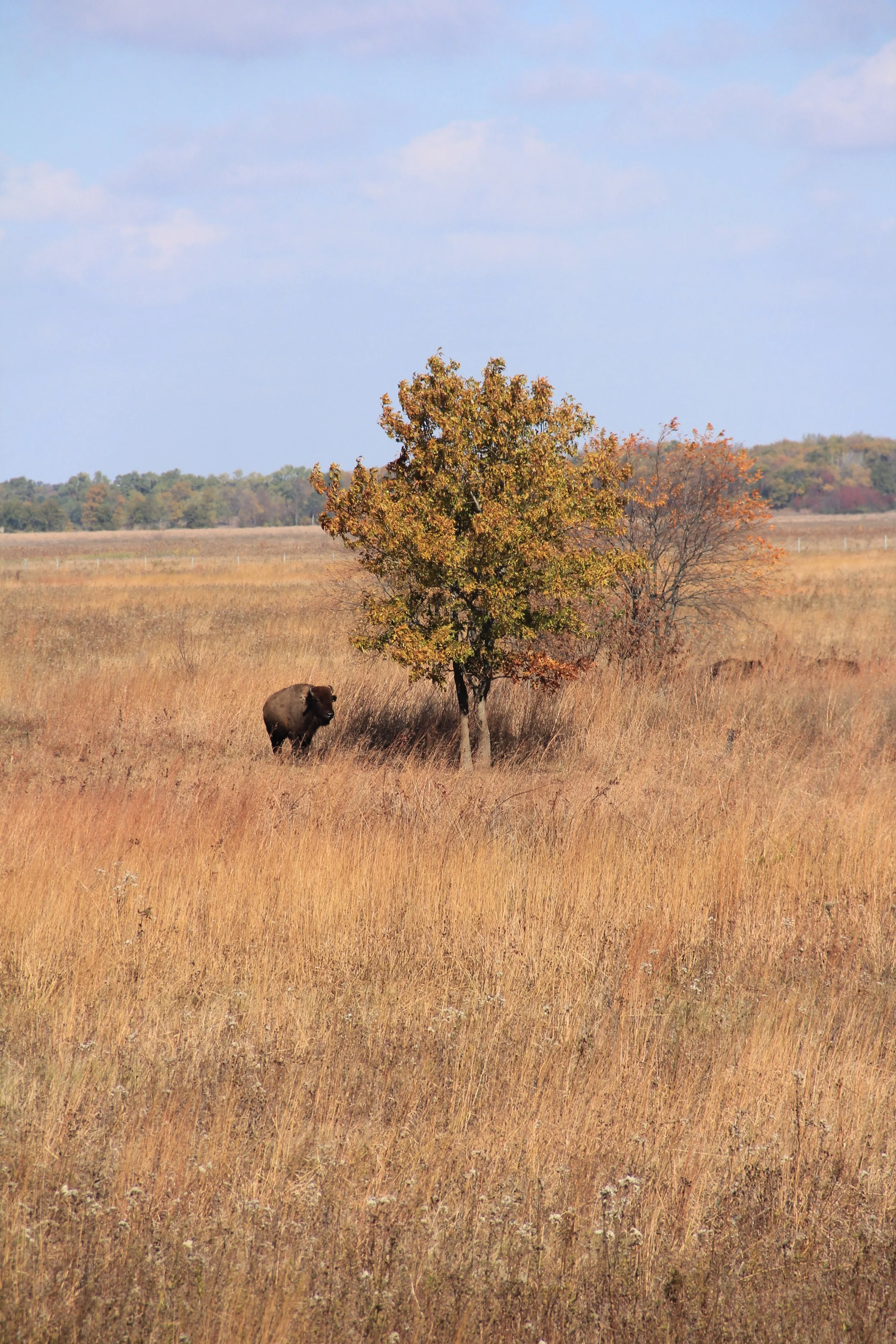 A brown bear standing in a grassy field with a tree, under a cloudy sky.