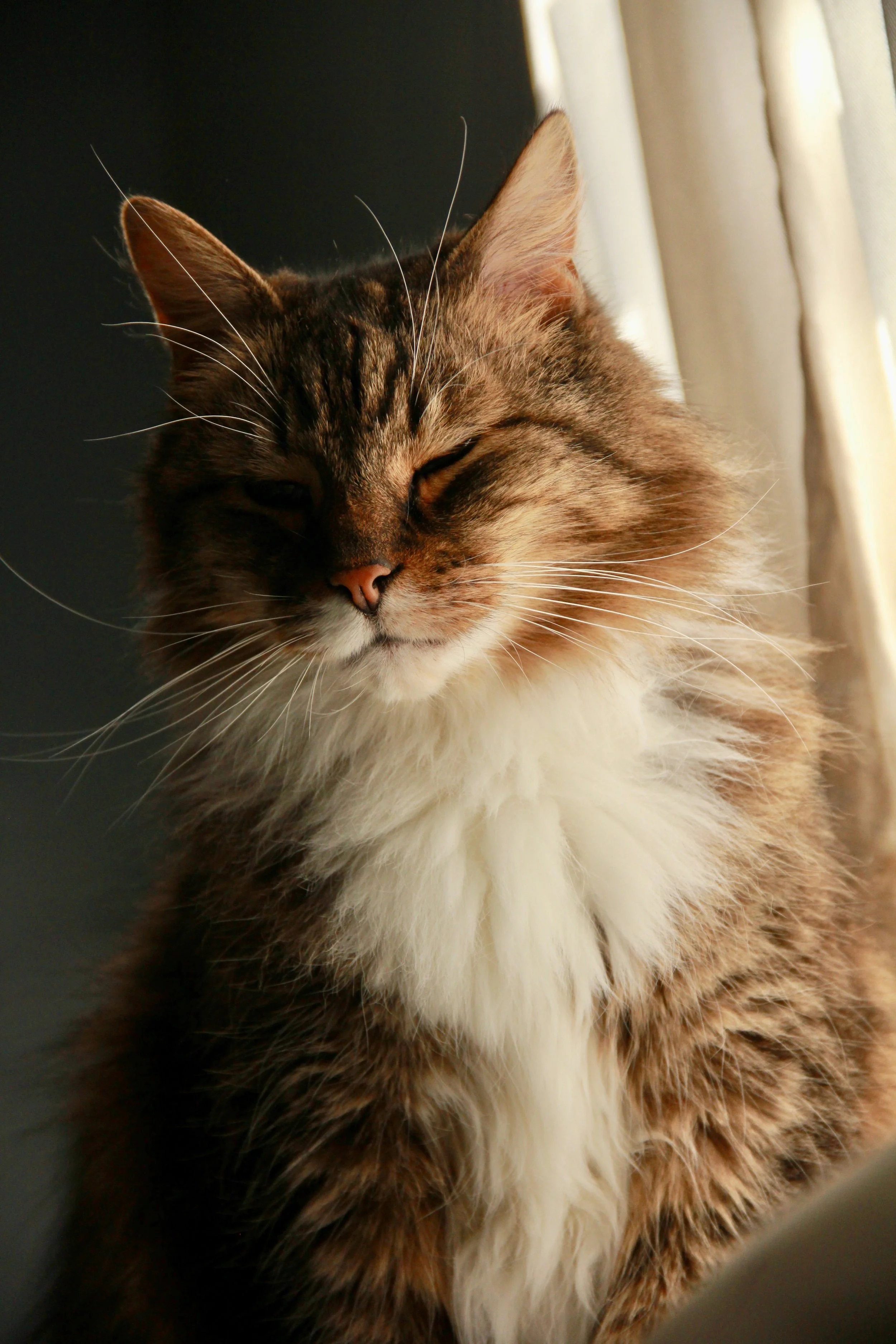 Close-up of a fluffy brown and white cat with eyes closed, sitting by a window with curtains.