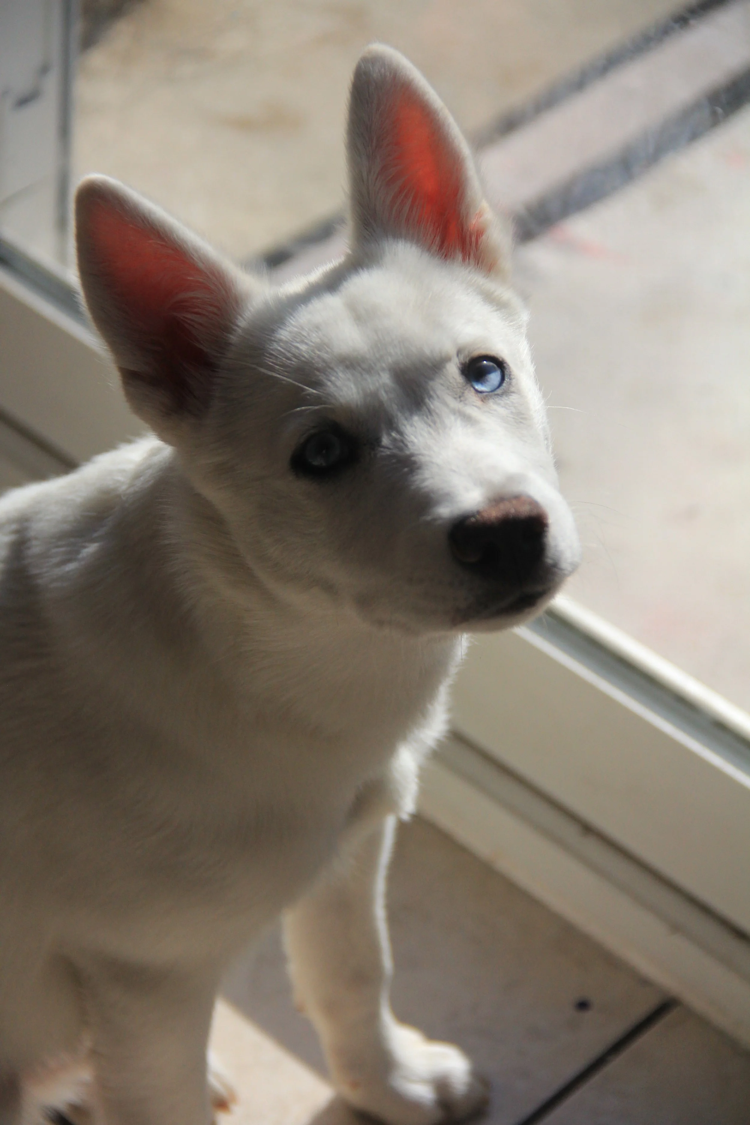 A white puppy with blue eyes sitting by a glass door, looking up.