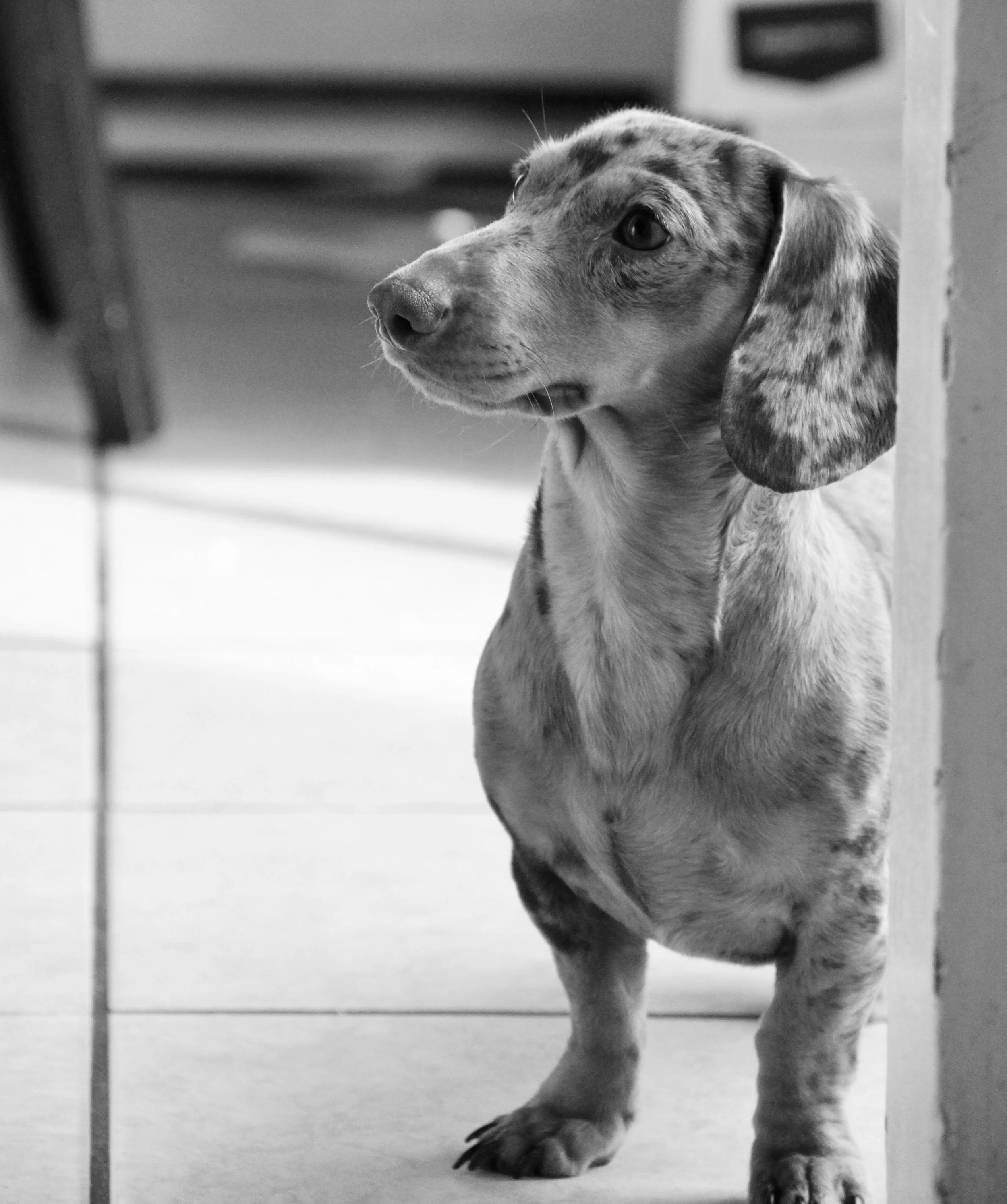 A black and white photo of a puppy, looking curiosity while hiding behind a corner.