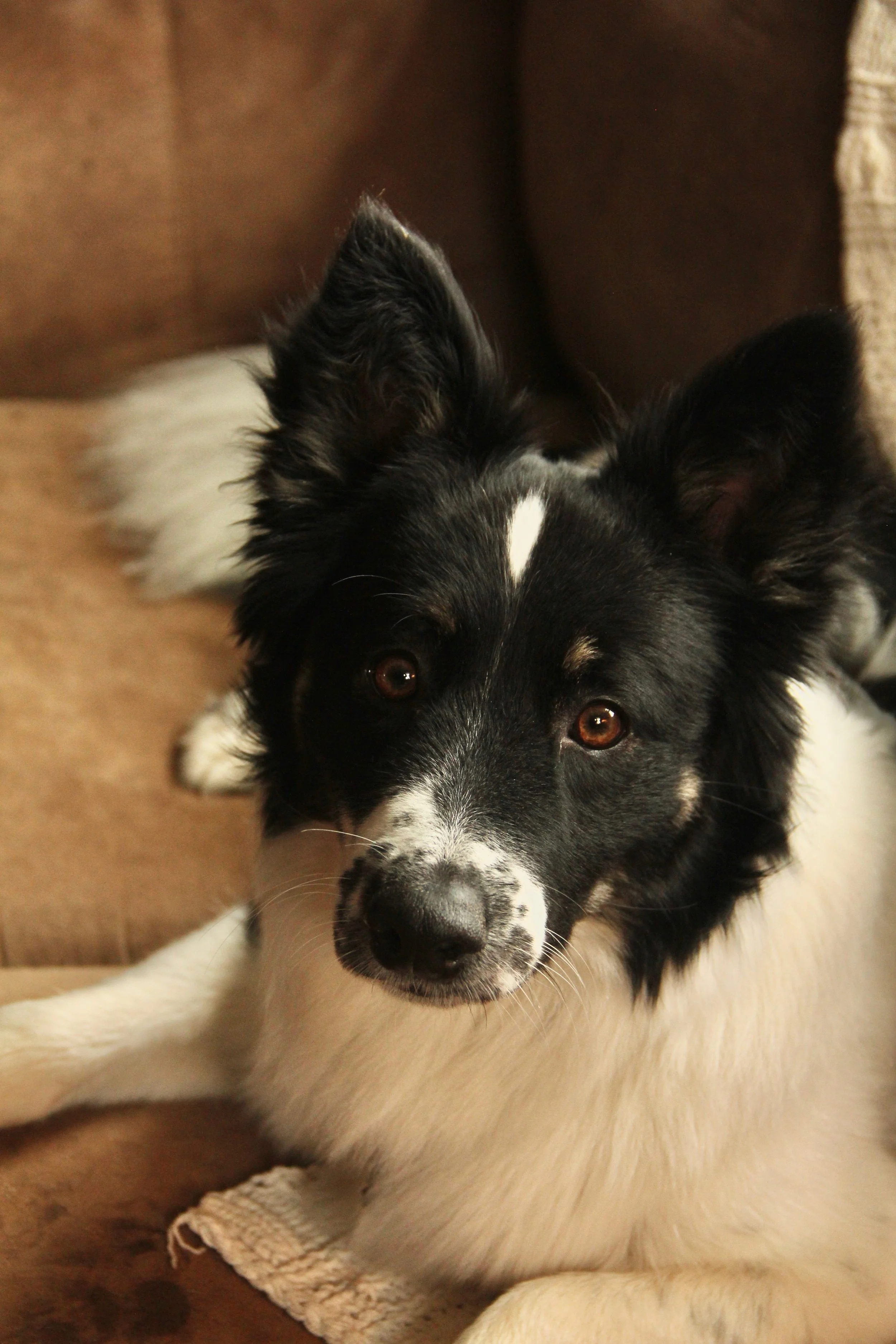 A black and white dog with striking facial markings, lying on a brown couch and looking at the camera.