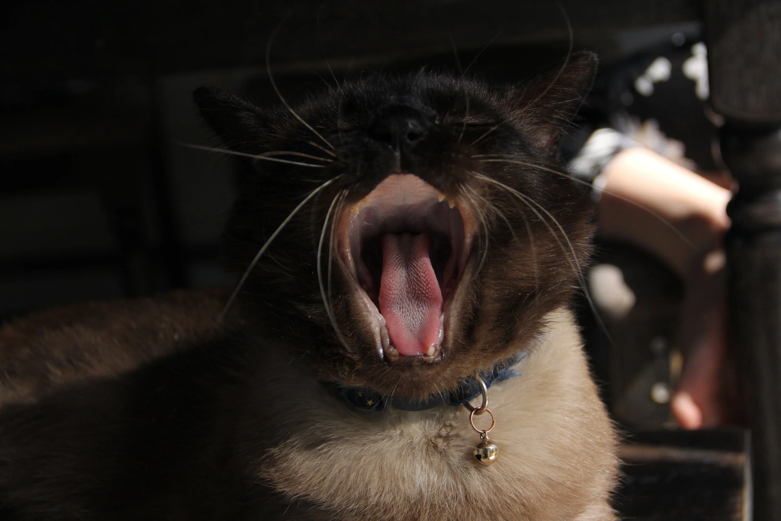 A cat yawning with its mouth wide open, revealing teeth and pink tongue, with a black collar and gold bell, under a dark piece of furniture.