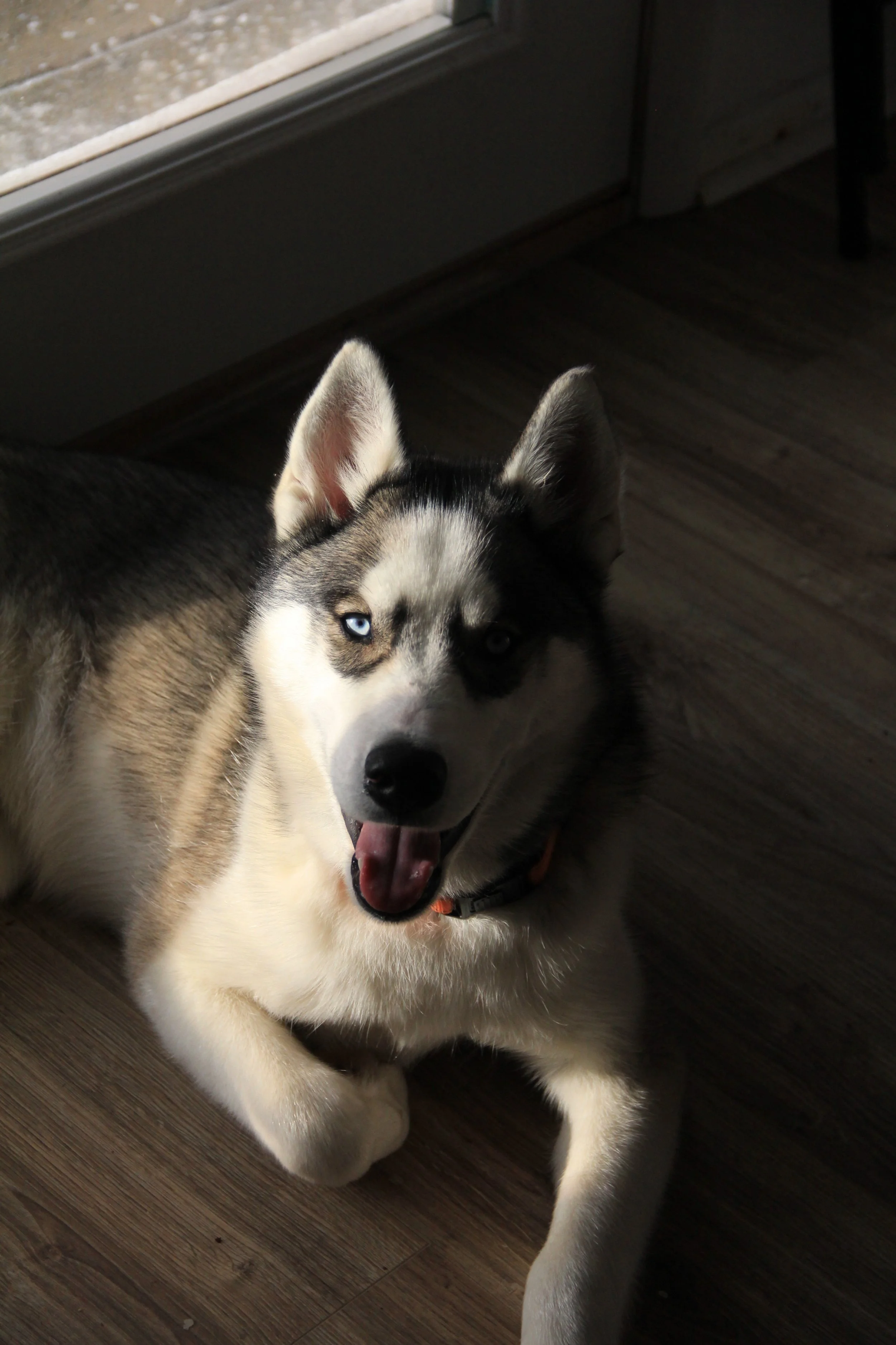 A Siberian Husky dog lying on a wooden floor near a glass door, looking happily at the camera.