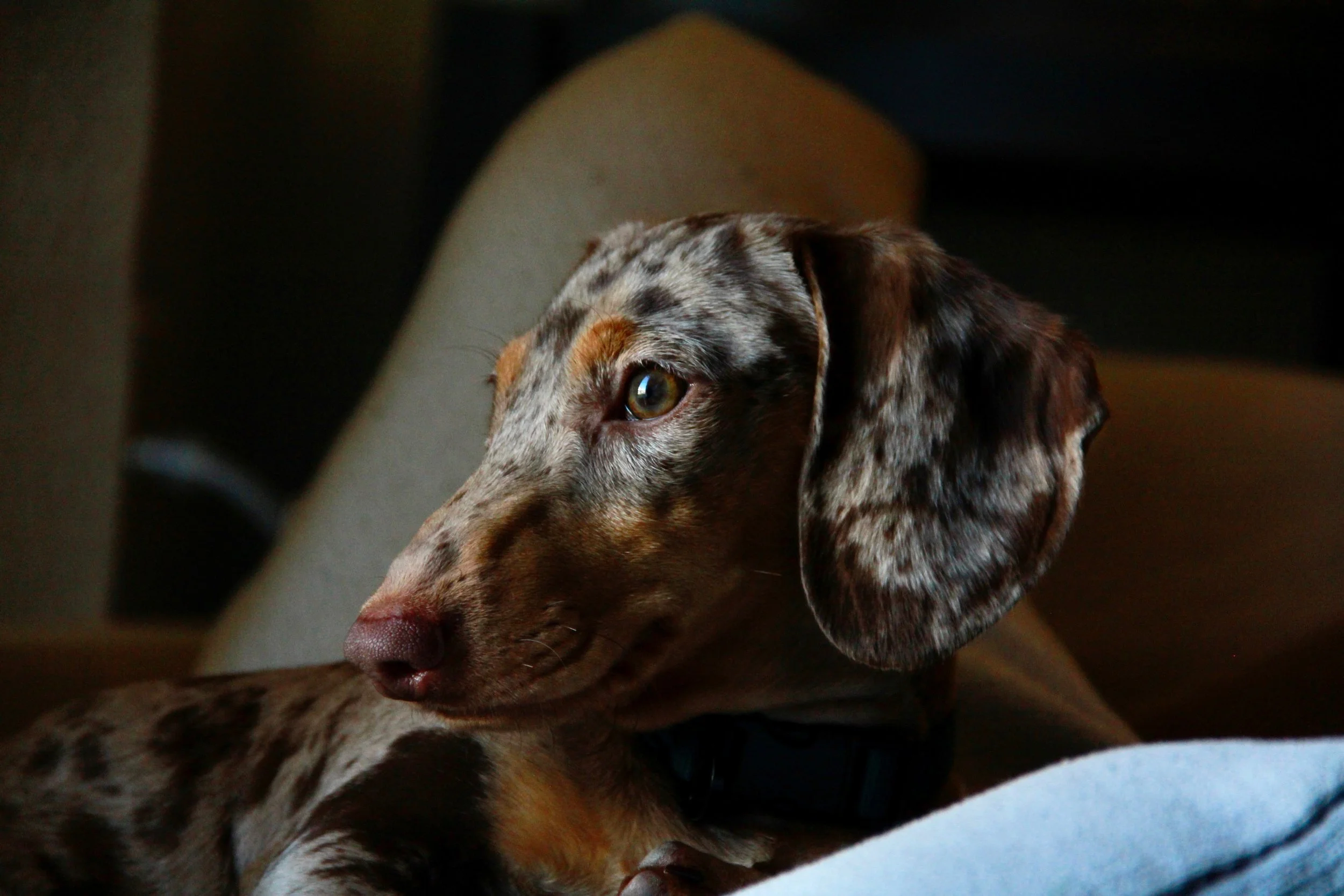 Close-up of a dappled brown and gray Dachshund dog lying on a person's lap indoors.