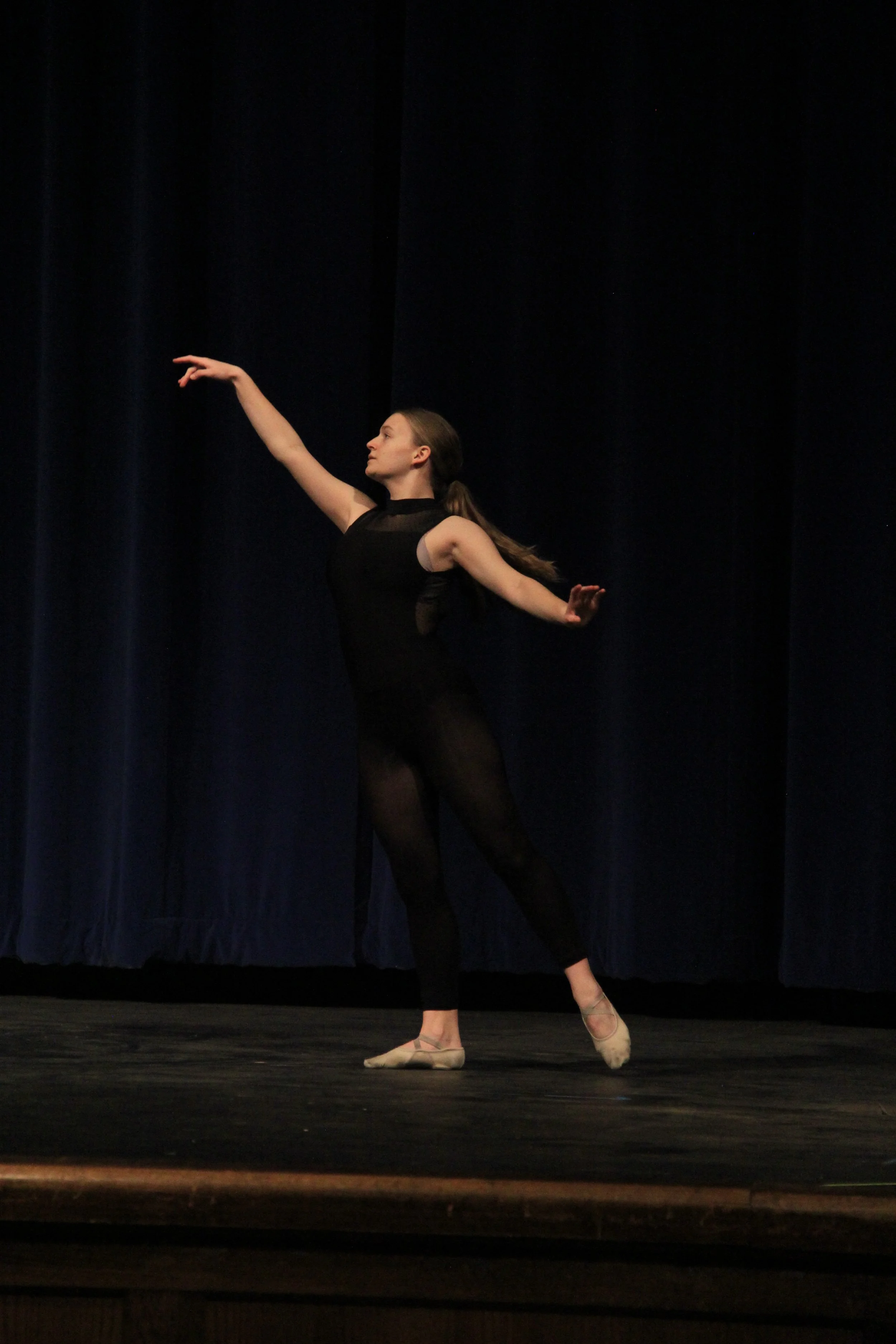 A young female ballet dancer performing on stage in a black dance outfit, with dark curtains in the background.