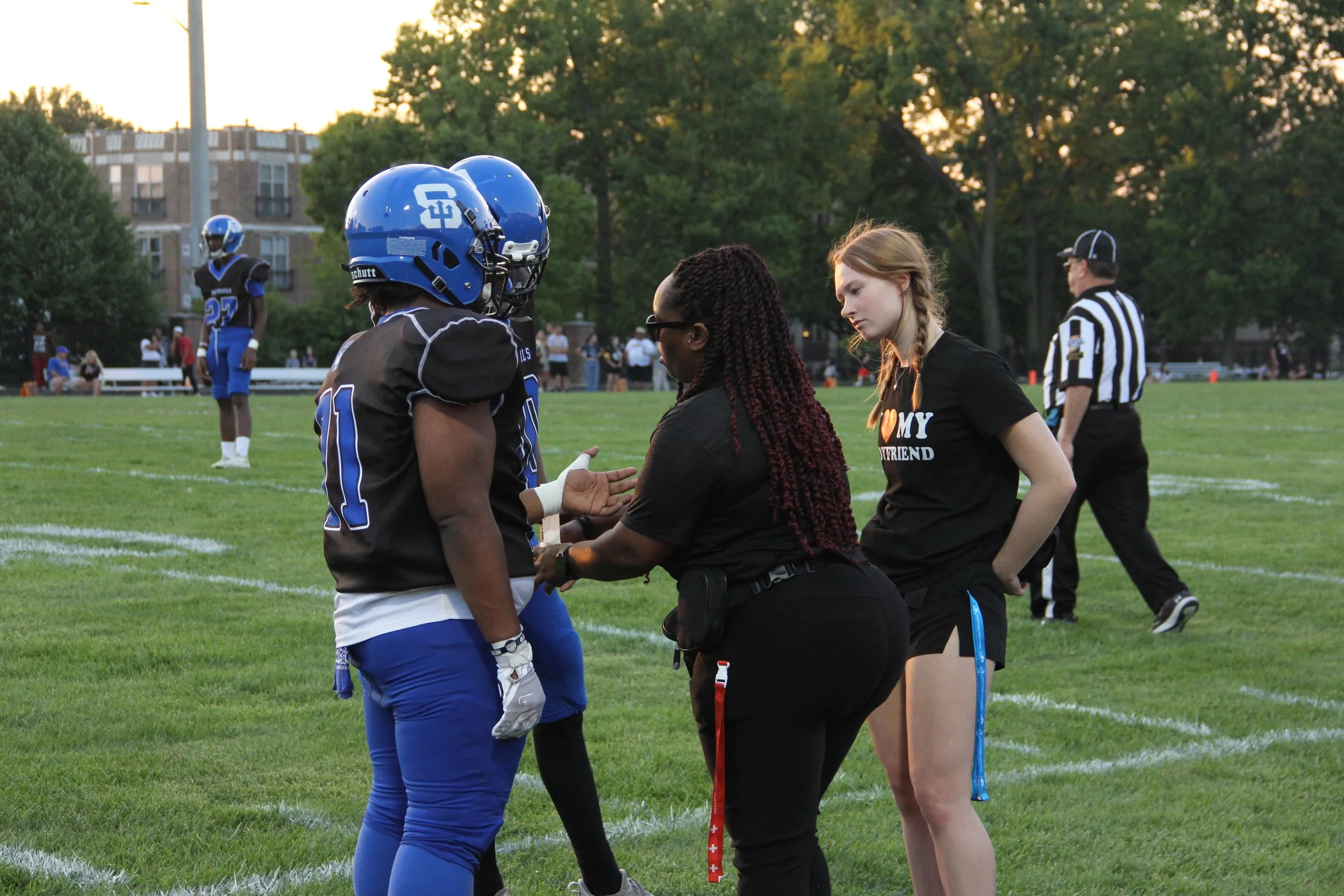 Football players and officials on a grassy field during a game, with a woman in a black shirt and shorts preparing to help a player with their arm, and another woman watching, with people and trees in the background.