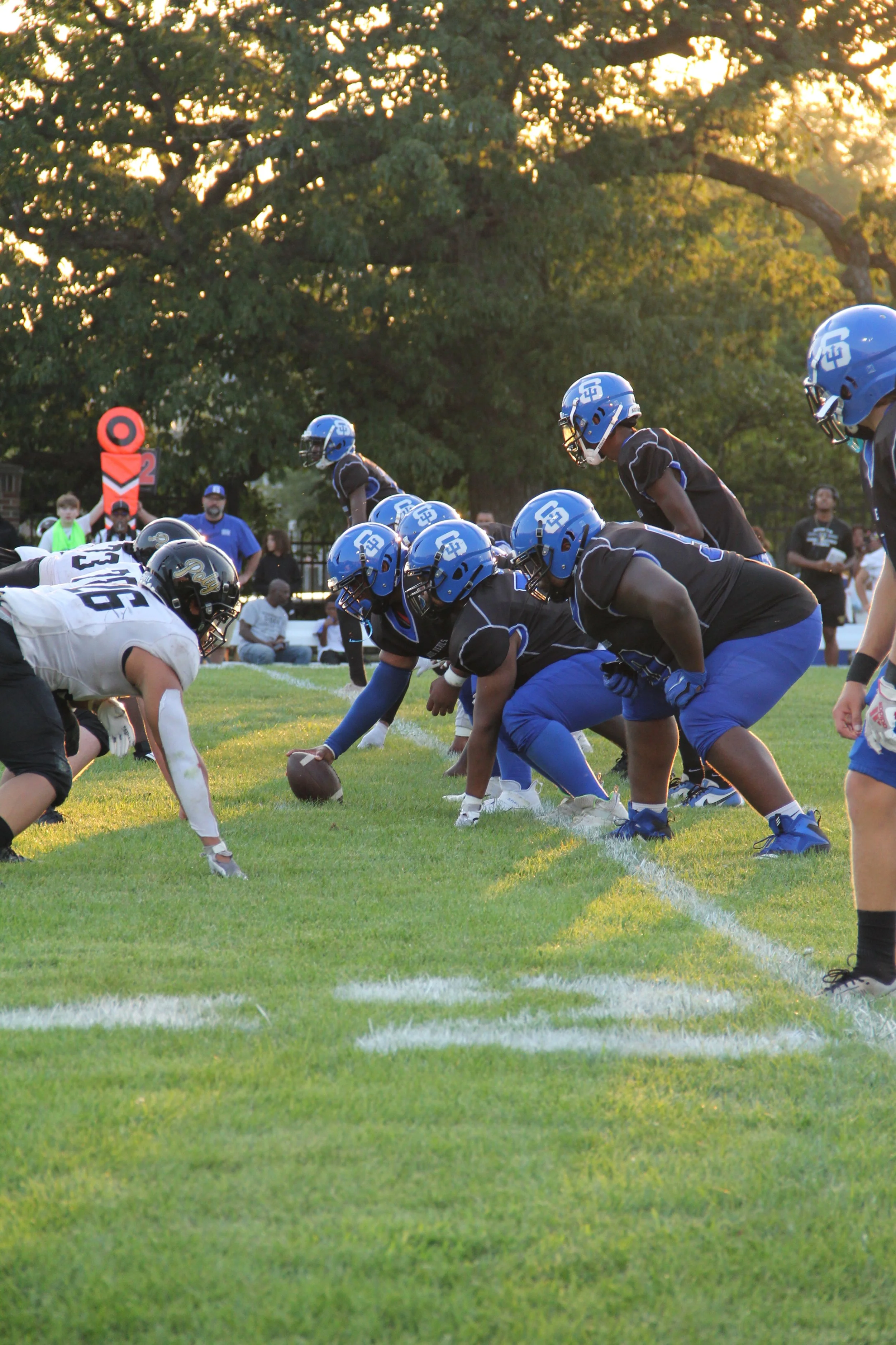 Football players in black and blue uniforms and helmets on the line of scrimmage during a game, with a referee and spectators in the background, under a sunset sky.
